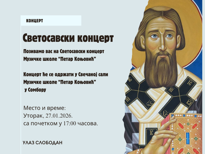 На Светосавски концерт, који ће се одржати 27.01.2026. са почетком од 17:00 часова, у Свечаној сали Музичке школе „Петар Коњевић“ у Сомбору.